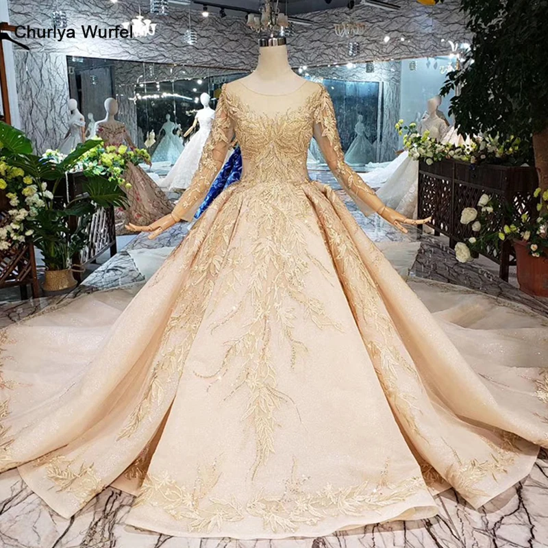 Ls11555g Oro Vestido Para Boda Boda Velo O Cuello De Manga Larga Flores Vestido De Novia Con Tren فساتين طويله Vestidos De Novia Aliexpress