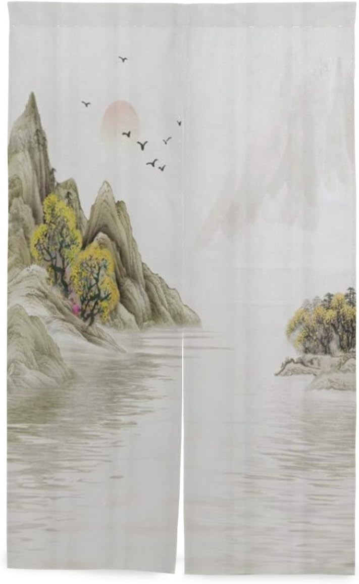 JISMUCI Curtains for Doors,Chinese Landscape Painting Art Decoration Watercolor Sunrise Mountain Lake Tree Plant Bird,Kitchen living room partition: Amazon.co.uk: Kitchen & Home